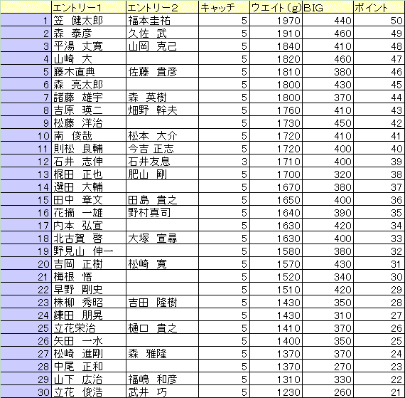 2位は、1910gで森 久佐ペア。3位は1840gで平湯 山岡ペア 。4位には1820gをマークした山崎大選手。そして5位には1810gで藤木 佐藤ペアが入賞した。