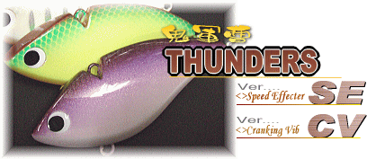 このサンダースCVは、クランクベイト的ニュアンスをバイブレーションにイングルーズドしたクランキングバイブ。通常のバイブレーションの持つ、ストラクチャーから離れたサスペンダーやベイトフイッシュ付きの回遊性の強いバスをバイトに持ち込む「高速波動」というアクション面の利点をそのままに、コントロールキャステイングのしやすさ、カバーの回避能力等を向上させることにより、本来クランクベイトが得意とするシュチエーションでのバイブレーション活用を可能としました。